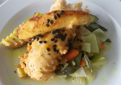 filet de sabre servi avec une banane cuite et une sauce maracudjà