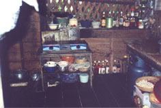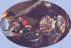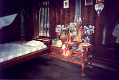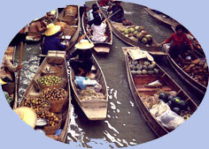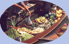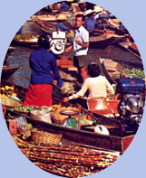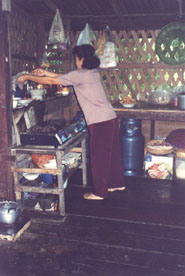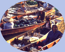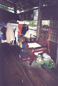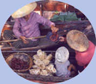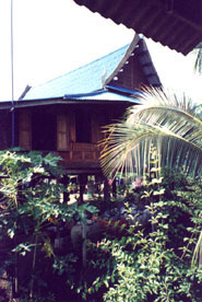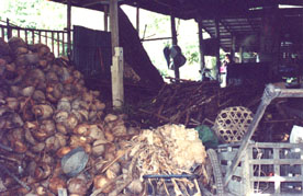 | Le temps est magnifique, il le sera d'ailleurs pendant 15 jours avec une température moyenne de 30°. Avant d'arriver au marché flottant un petit arrêt pour faire connaissance avec la noix de coco et ses multiples utilisations. Nous en profitons pour jeter un oeil dans la maison voisine. |