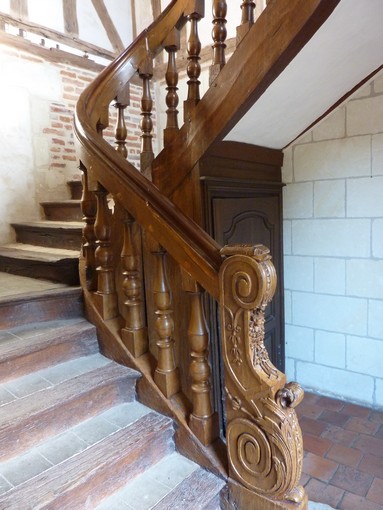 Nous accédons à l’étage supérieur par un magnifique escalier tout en bois du XVII ème, avec rampes à ballustres à double poire.