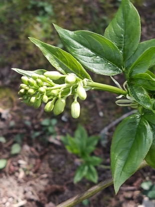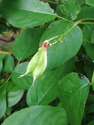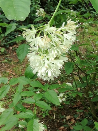 La floraison, printanière et mellifère, est sous la forme de panicules pendantes de petites fleurs blanc nacré composées de 5 pétales alternes avec les sépales et de 5 étamines, diffusant un doux parfum entre noix de coco, amande et fleur d'oranger. La fructification est elle aussi très intéressante et originale, sous forme de petits « lampions » gonflés, de 3 à 4 cm, contenant chacun une amande vert pistache, comestible, à la saveur douce et âcre.