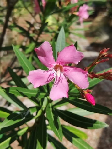 Communément appelé laurier rose, le nerium oleander est un arbuste d'environ 2 mètres de hauteur dont les fleurs blanches, jaunes, rouges ou saumon s'épanouissent de juillet à septembre.