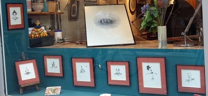dans la vitrine de la Petite Encadreuse à Tours dans le cadre de la semaine du cirque - encre de Chine au pinceau