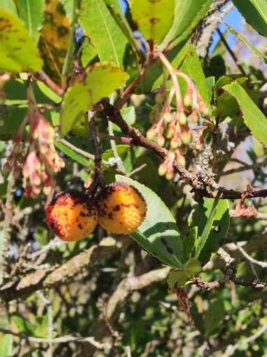 l'arbousier nous offre une belle récolte de fruits et les fleurs annonçant la récolte 2023 sont bien présentes